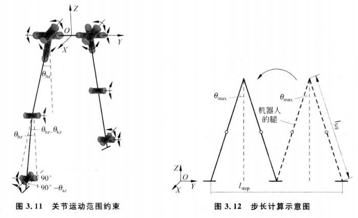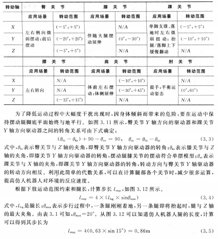 (1)運動(dòng)范圍約束。智能接待智能接待機器人各個(gè)關(guān)節都有其運動(dòng)范圍,需要對各個(gè)關(guān)節的運動(dòng) 范圍進(jìn)行約束。為了使其能夠更穩定地步行,要分別對智能接待智能接待機器人下肢12 DOF 的運動(dòng) 和上體腰及手臂等7個(gè)關(guān)節的運動(dòng)進(jìn)行約束。全身各個(gè)關(guān)節的運動(dòng)范圍分別如表3.1 所示,由于兩條腿的運動(dòng)范圍一樣,所以表3.1中沒(méi)有區分左右腿,只是按照關(guān)節來(lái)描 述。運動(dòng)幅度正負的標定是以直立姿態(tài)為標準,根據關(guān)節轉動(dòng)方向來(lái)定,順時(shí)針?lè )较驗?負,逆時(shí)針?lè )较驗檎?